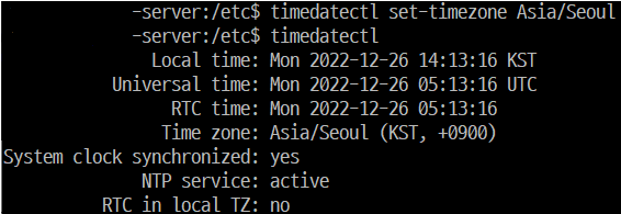timedatectl set-timezone Asia/Seoul 을 입력하여