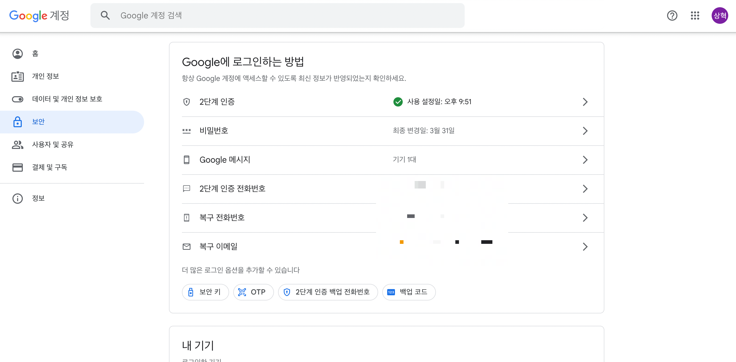 Google 계정 관리 > 보안 > Google에 로그인하는 방법 > 2단계 인증
