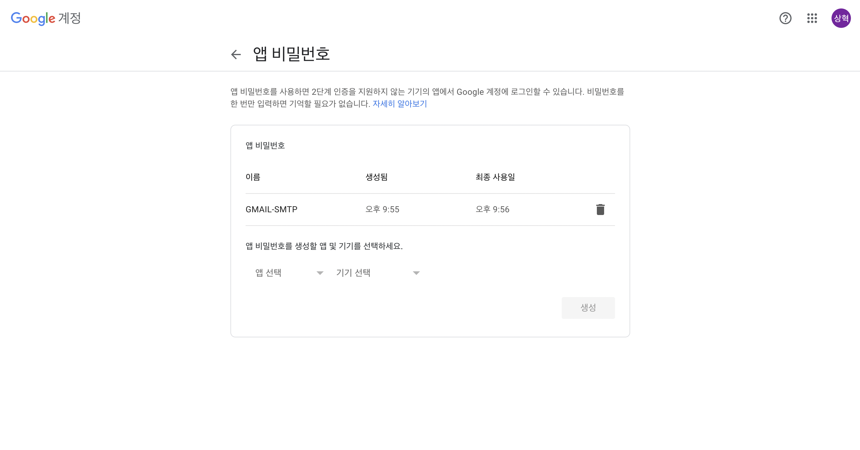 Spring Mail을 설정할 때 username에 이 구글 메일 주소, 그리고 password에 지금 발급받은 앱 비밀번호를 사용한다.